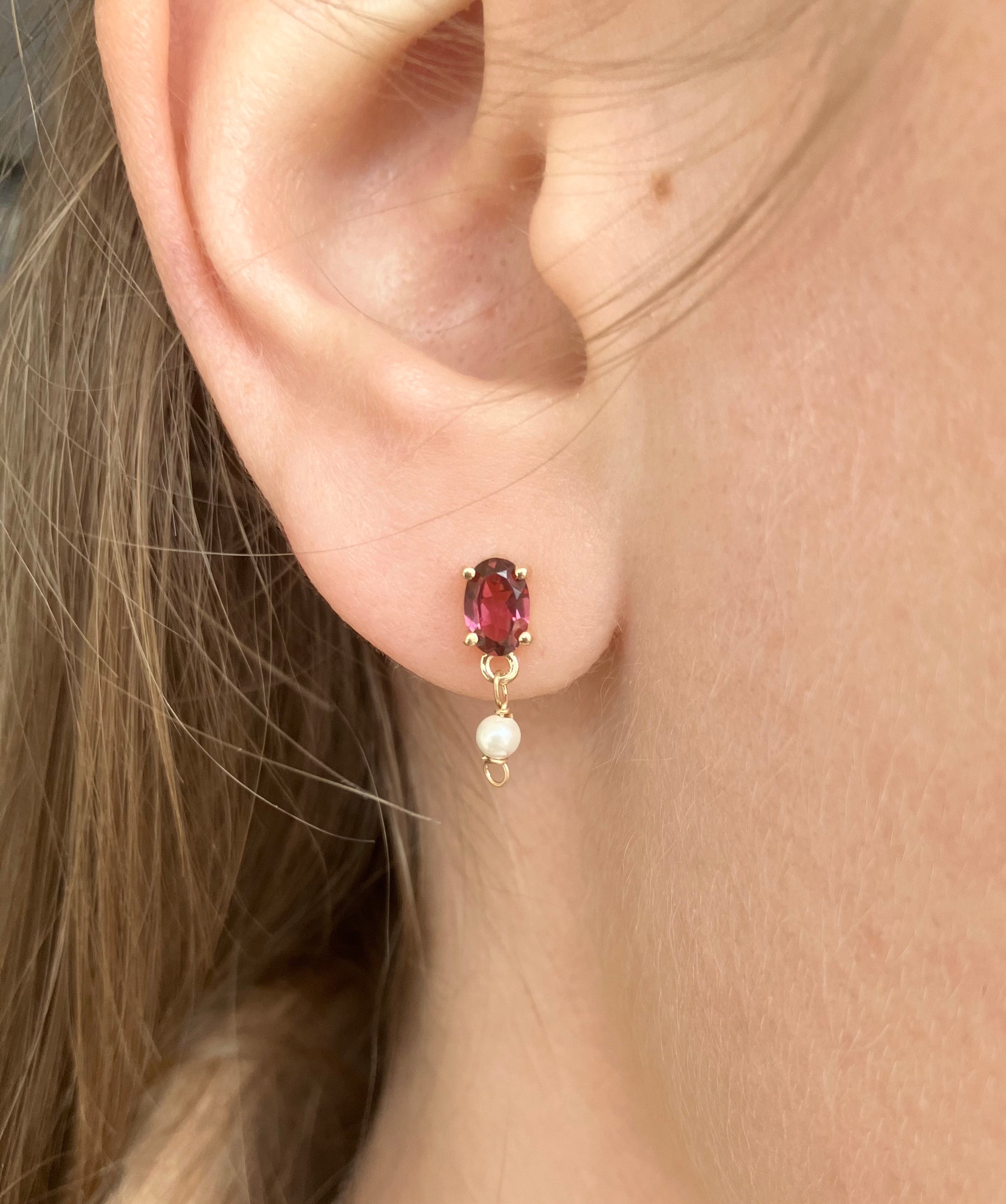 These dainty earrings are set in 14K yellow gold and feature a 4x6mm oval pink tourmaline with a pearl dangle. Simply beautiful.