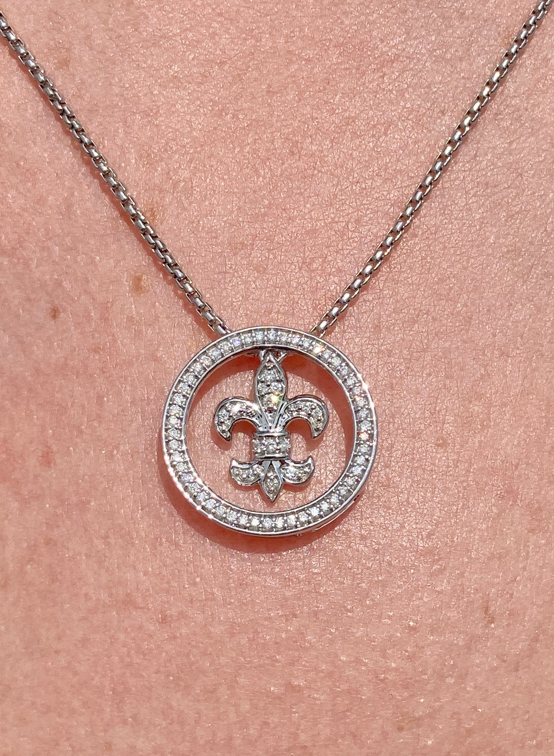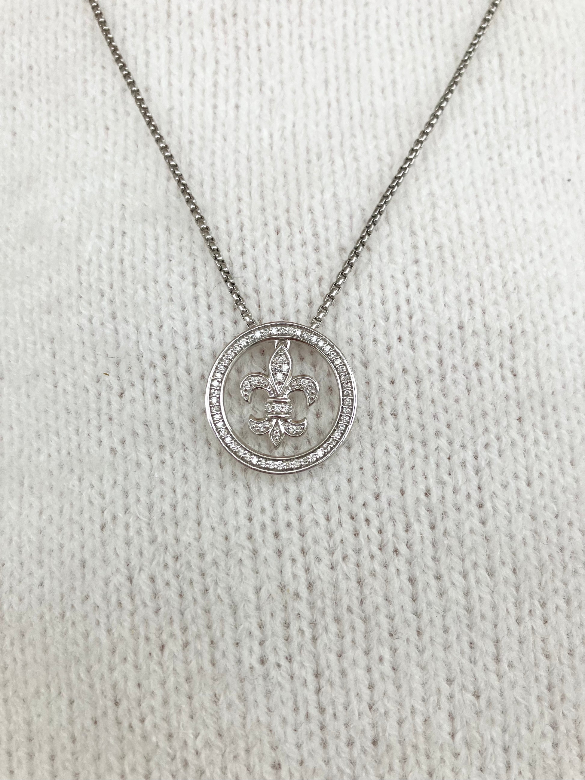 This one-of-a-kind necklace is one you won't forget! The 14K white gold pendant hangs on this 14K White Gold rounded box chain. Featured in the pendant are 64 round natural pave white diamonds set in a Fleur-De-Lis Halo, with a total of 0.19cts.