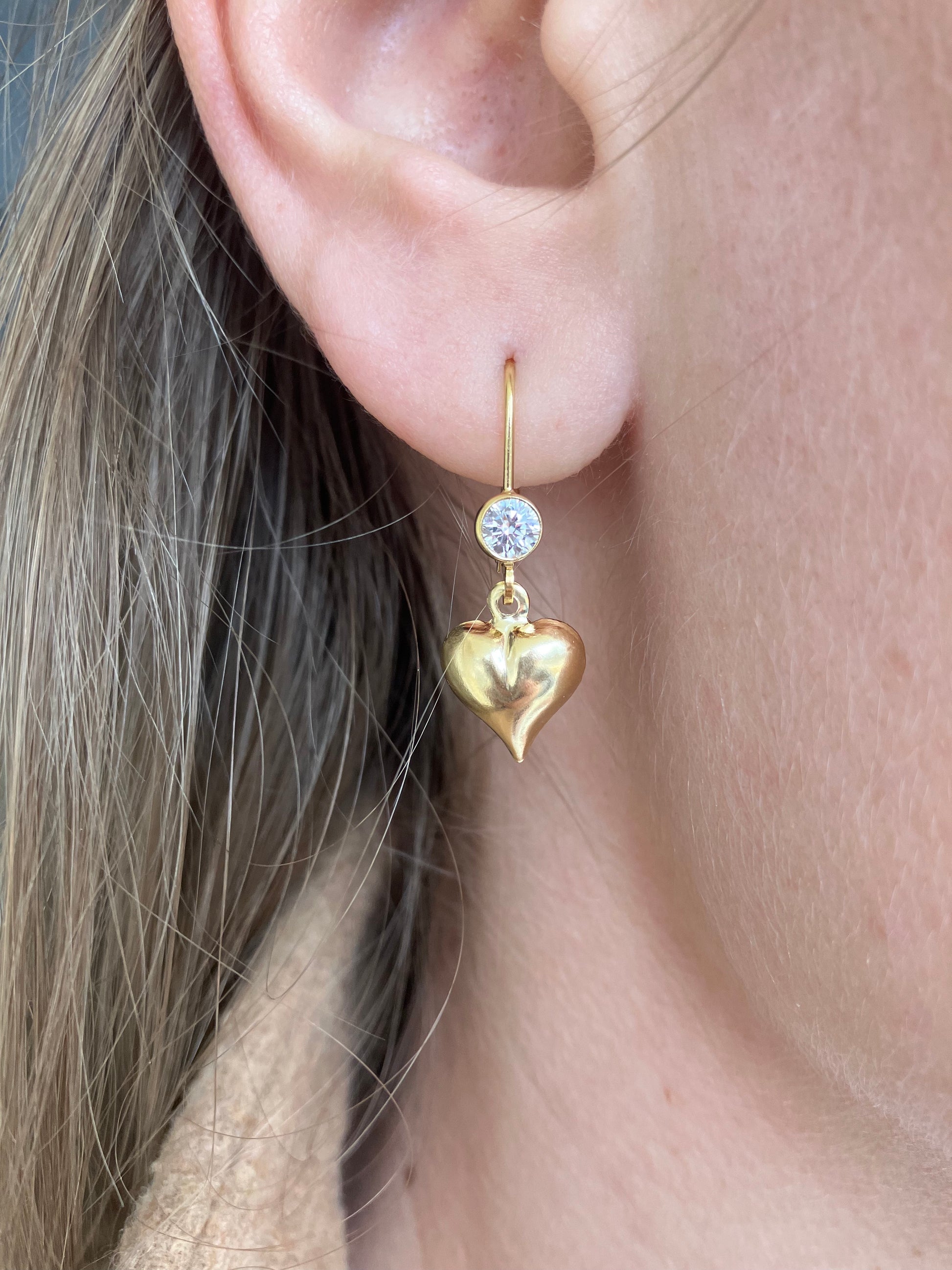 These lightweight and cute earrings are gold-filled and feature a round bezel set cz with a gold-filled dangle heart. Perfect for a day at work or a cute night out, be sure to pick up these beauties before they're gone! These earrings also have a matching gold-filled necklace as well in our necklaces section.
