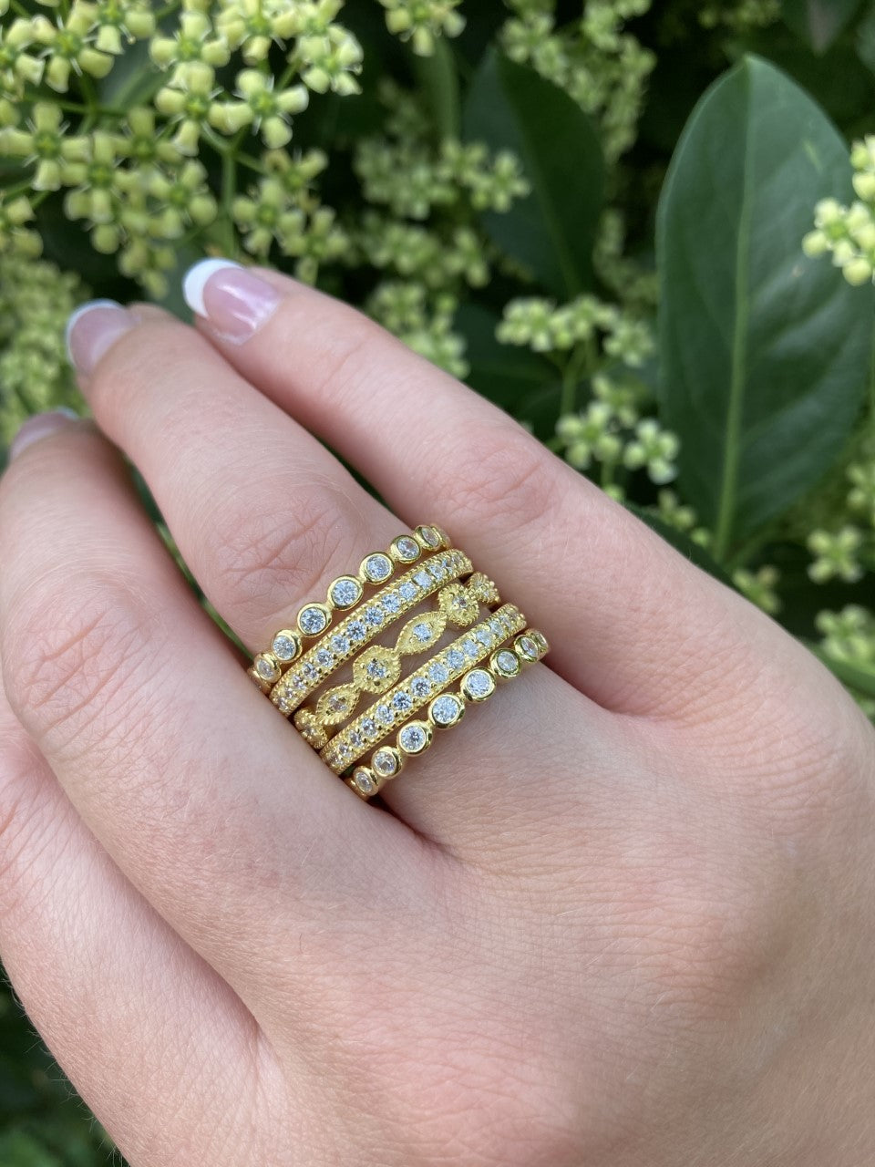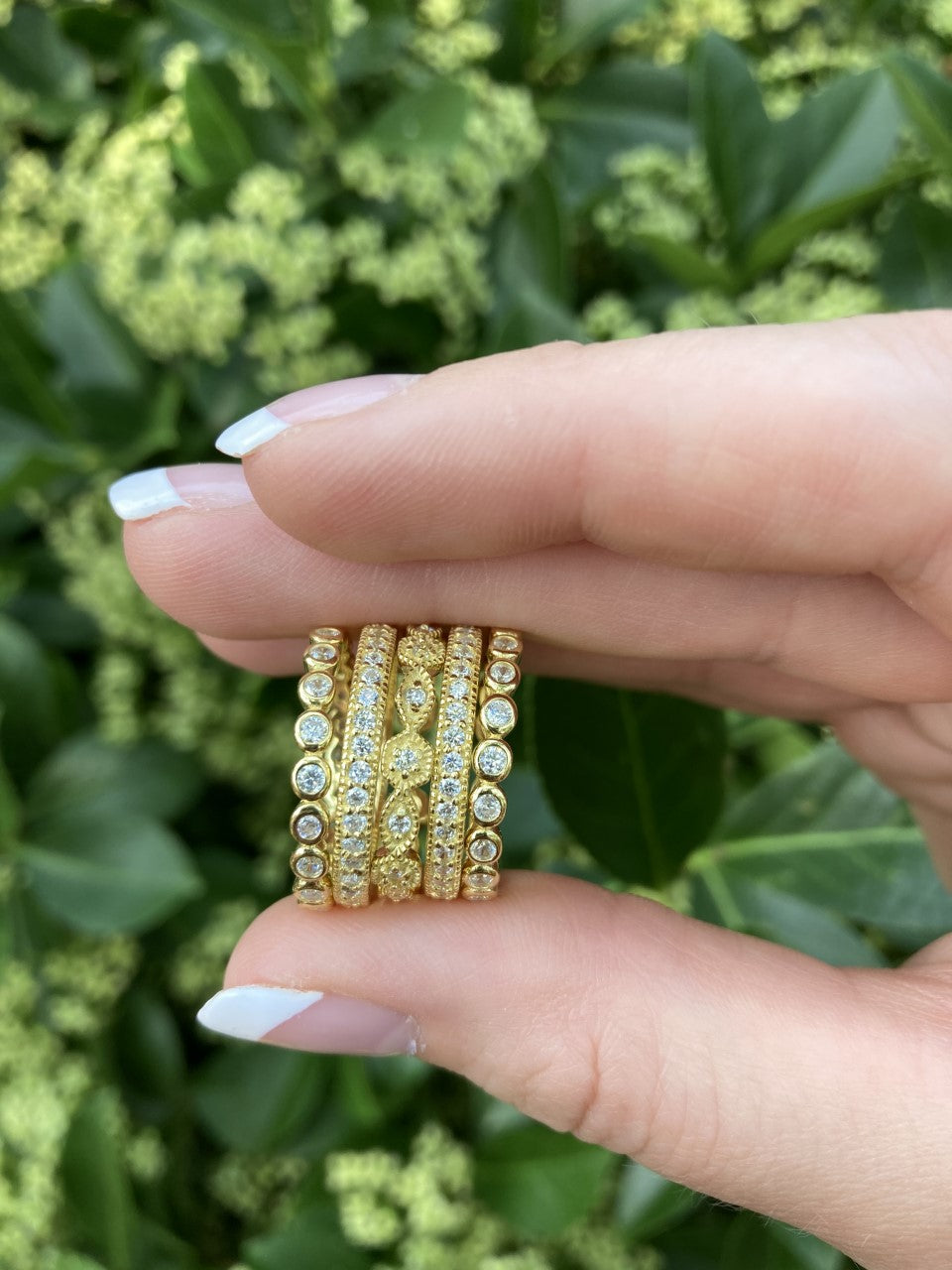 What a great set of gold-plated (over sterling silver) CZ rings! Whether you wear just 1 or all 5, they look great day or night. You will love wearing these together or stacking them with other rings you have. The possibilities are endless! Available in sizes 6 & 7!
