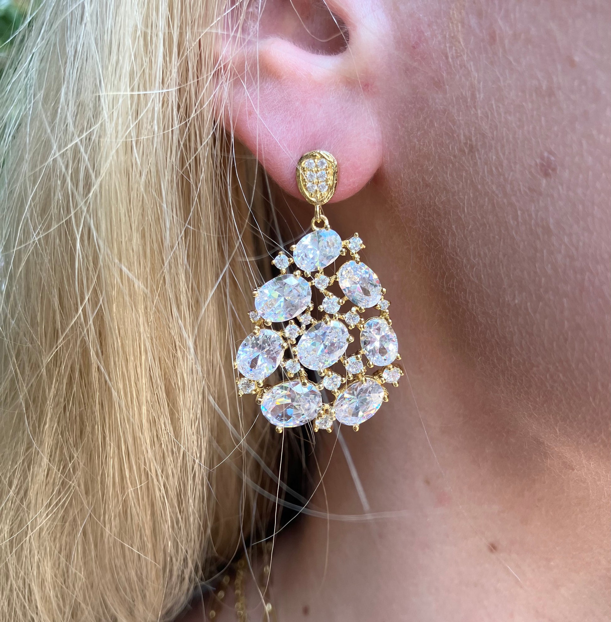 This gorgeous pair of statement earrings will make you want to go out on the town just so you can wear them because they are THAT gorgeous! Set in gold plated sterling silver, these earrings feature oval and round CS'z. We promise you will love these earrings just as much as we do!