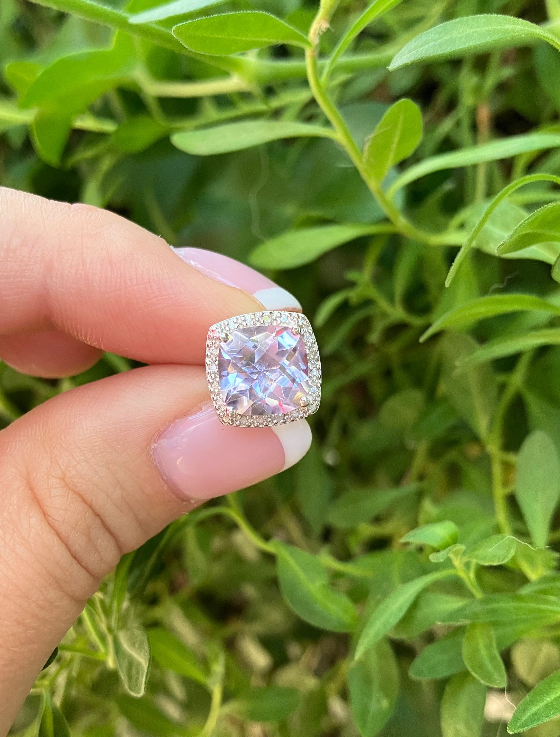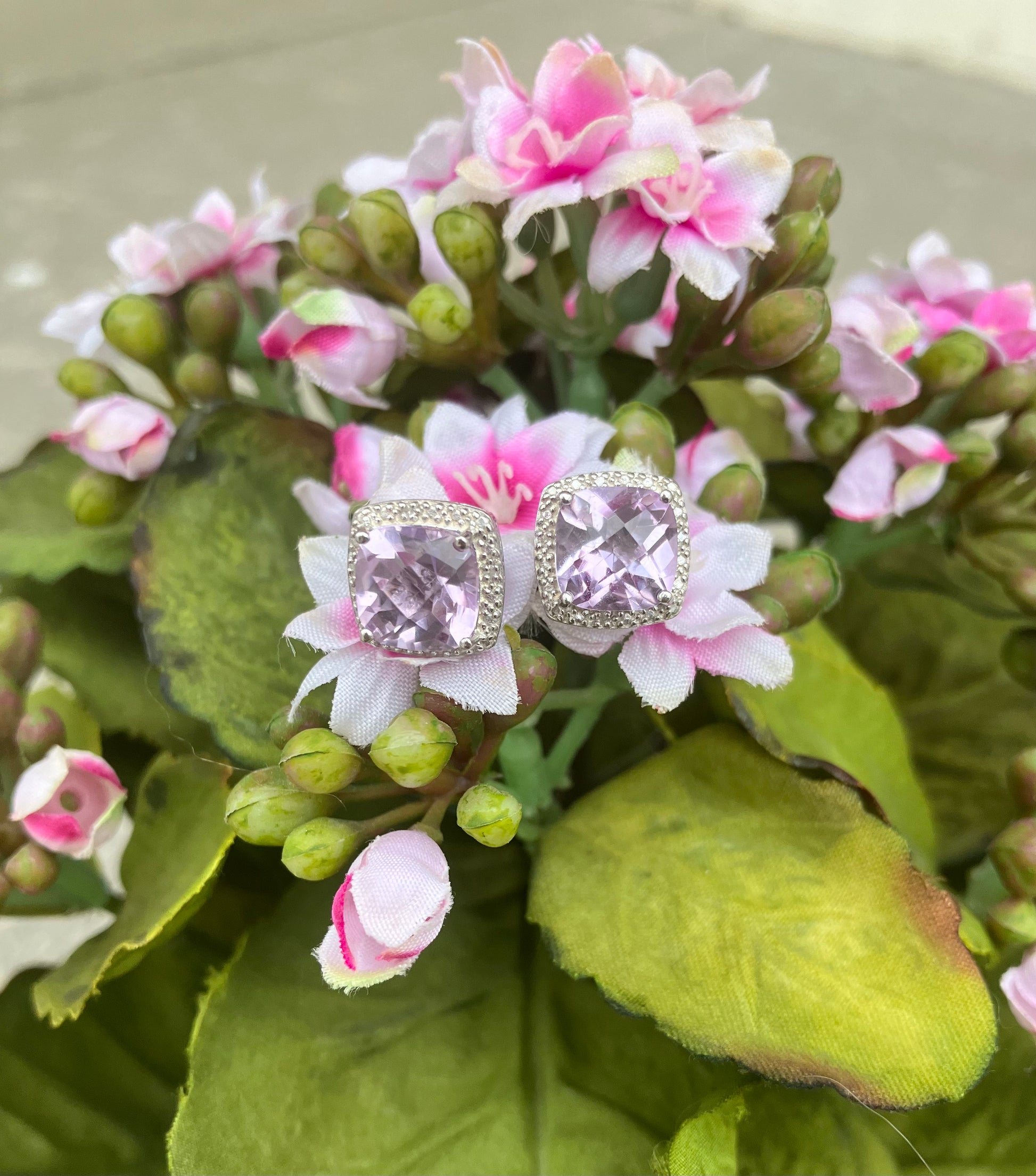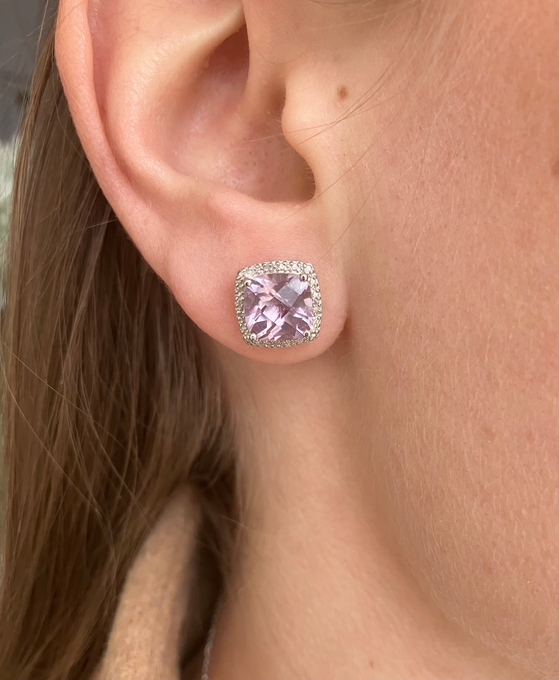 These beautiful stud earrings are set in sterling silver and feature a lavender pink quartz cushion cut center stone surrounded by a halo of white round diamonds! They are classy and are perfect for the woman who's active but still wants to sport some major sparkle!