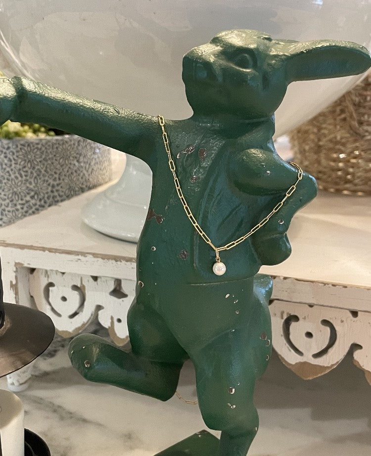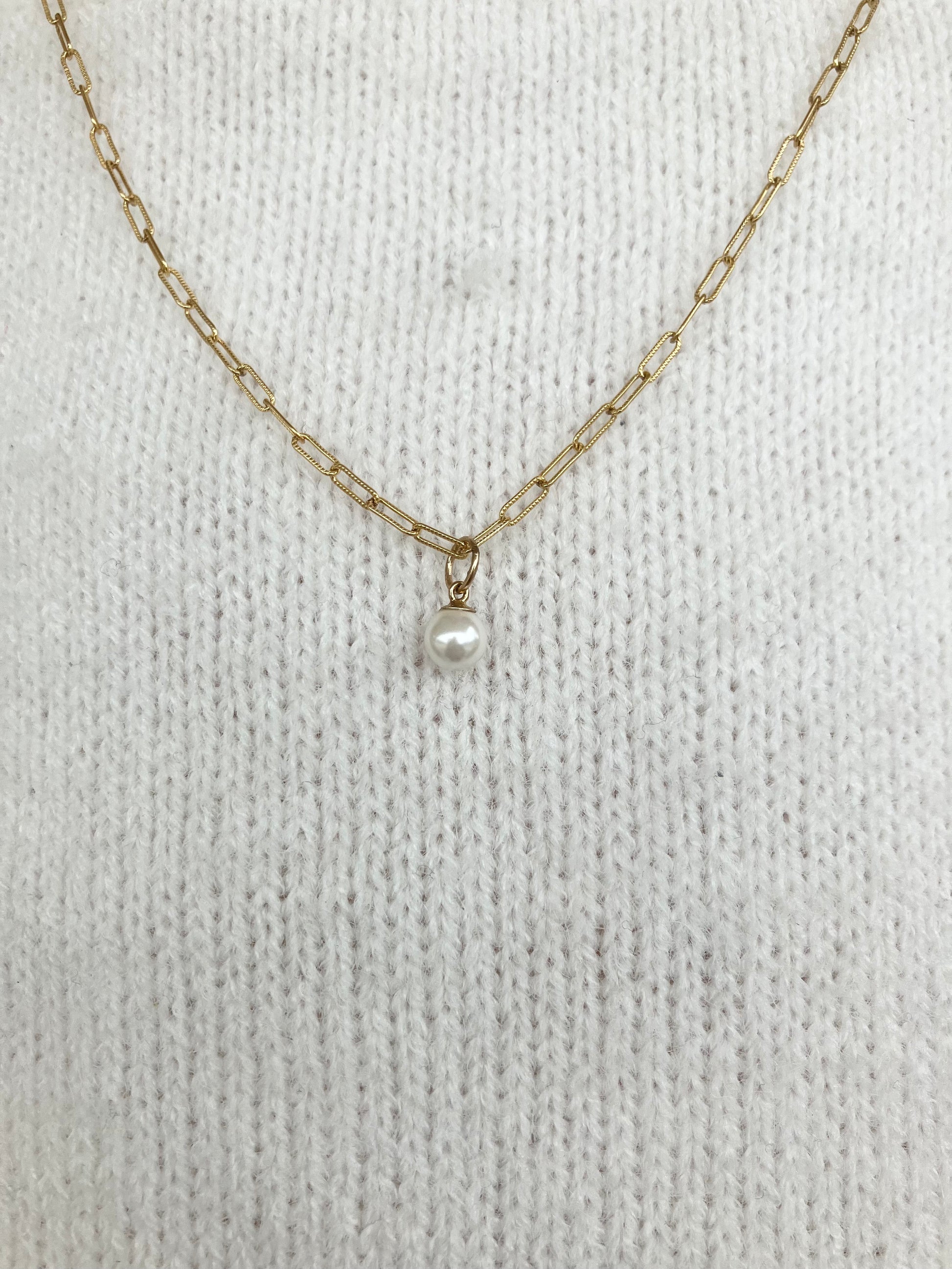 This beautiful and elegant gold-filled paper clip chain necklace features a round white pendant pearl and is an elegant addition to any outfit!