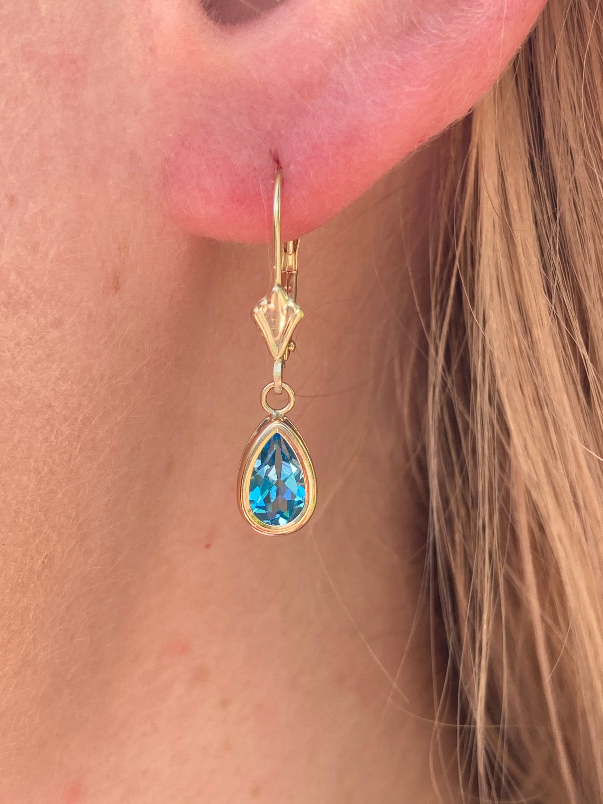 This gorgeous pair of 14K yellow gold dangle earrings have a Fleur-de-Lis lever-back post with an 8x5mm pear dangle that features a bezel-set faceted Swiss blue topaz gemstone. We love the vibrant blue color in these stones so if you love them too, we suggest you grab them quickly before they sell out!