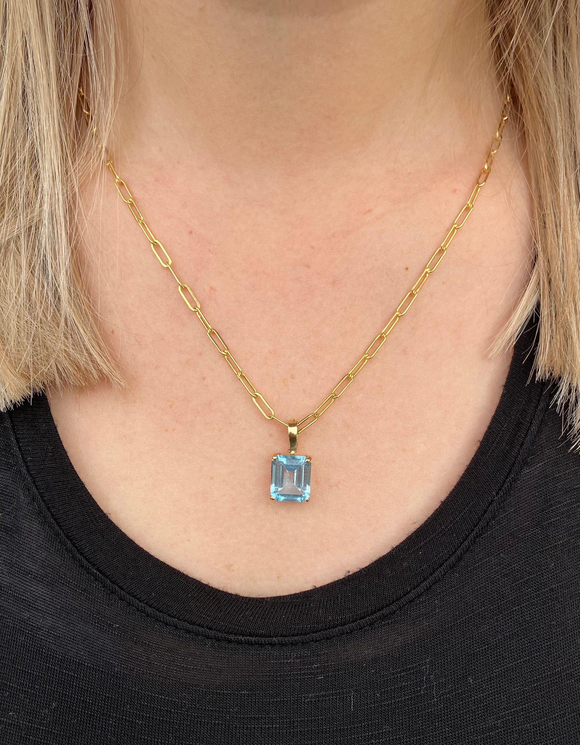 This oh-so-gorgeous necklace features a 20 inch gold-filled paperclip chain accented by a beautiful 10x12mm emerald-shaped sky blue topaz gemstone set in a 14K yellow gold pendant setting! This necklace is such a fun and modern necklace that would look great with your favorite little blue dress.