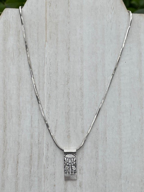 This is a wonderful sterling silver arts and crafts pendant on a nice sterling silver snake chain. The detailed design on the pendant is wonderful! The chain is 16". This a just a great everyday piece to layer with others.