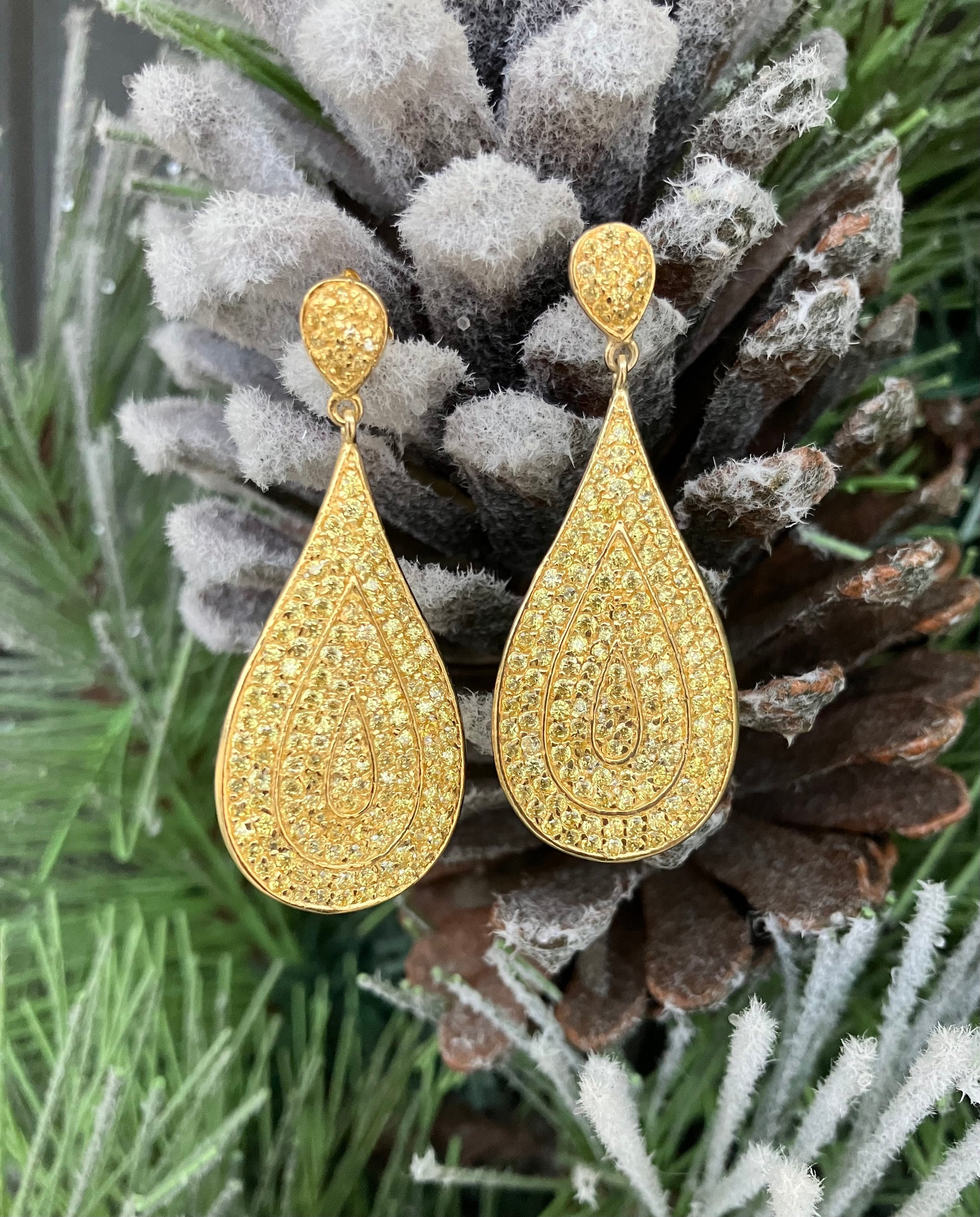 These statement earrings feature yellow round cz pave stones set in gold plated sterling silver. You can never wear too much yellow, and these earrings would go wonderfully with your favorite summer dress!