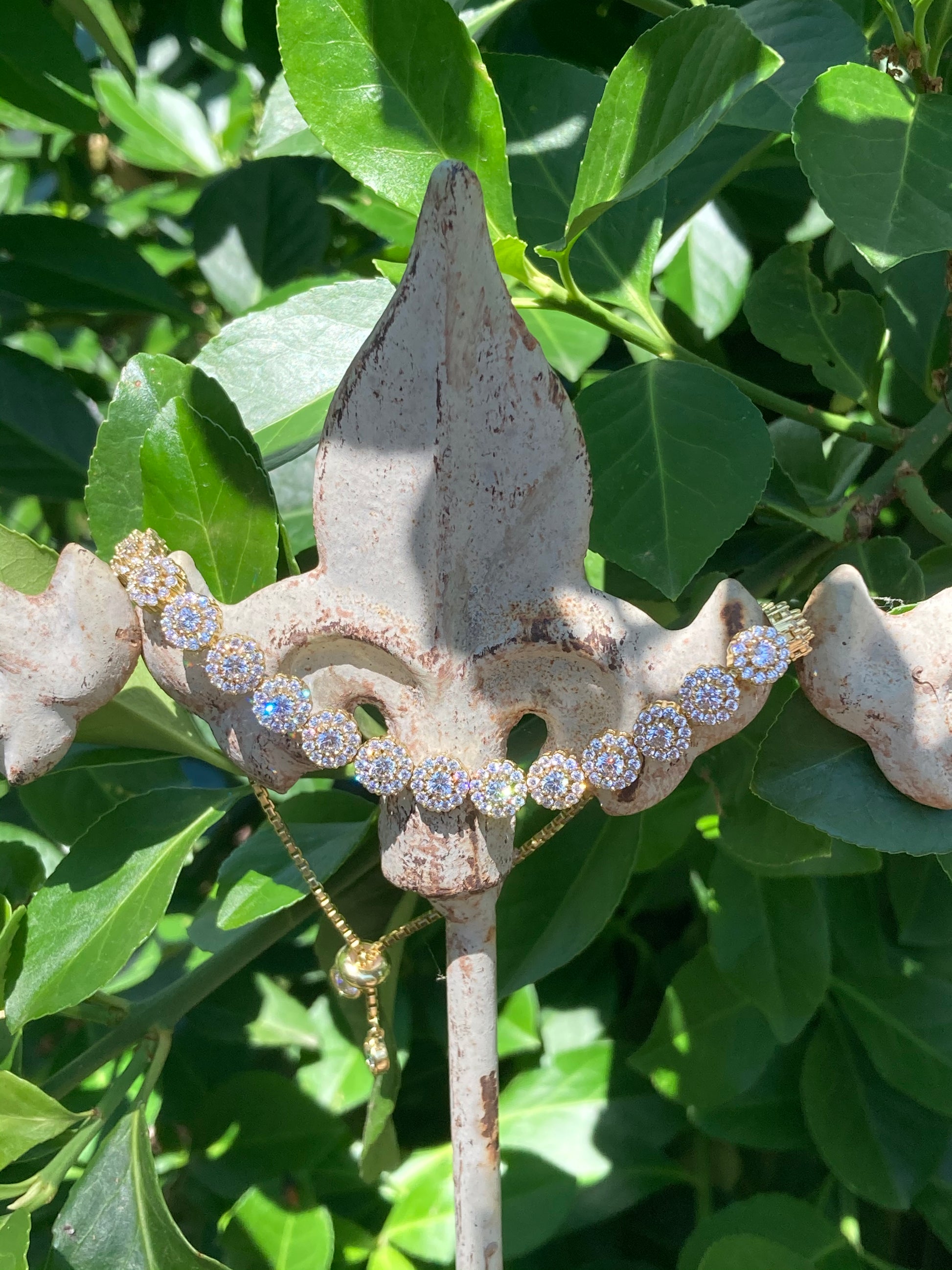 This yellow gold tone bracelet is wonderful not only because it's gorgeous, but because it's adjustable! It is set in sterling silver with a gold plating and features round CZs with a halo of smaller CZs surrounding them. This is a classic bracelet you can wear to dress up your outfit! Bracelet is 10" in length when fully extended.
