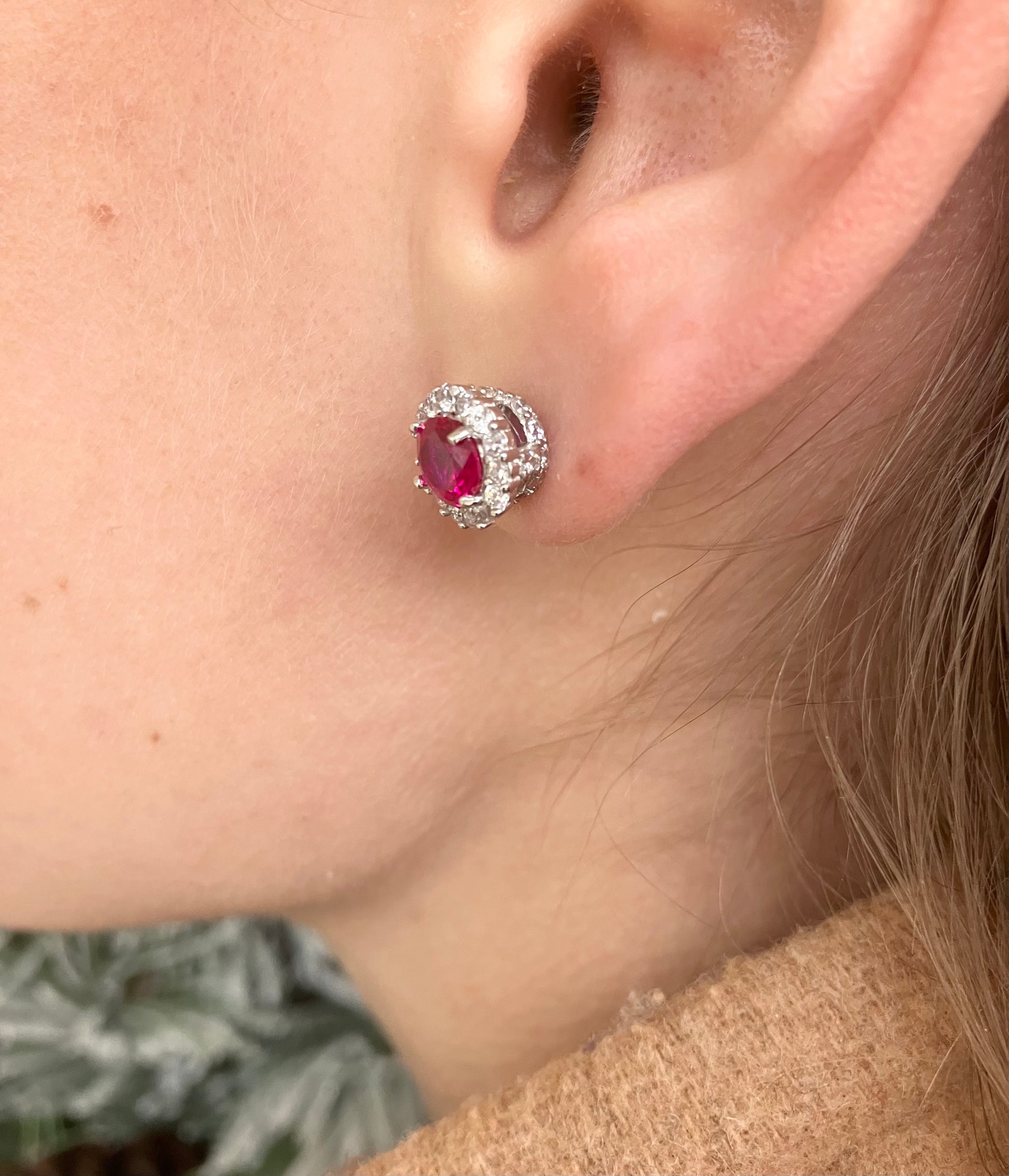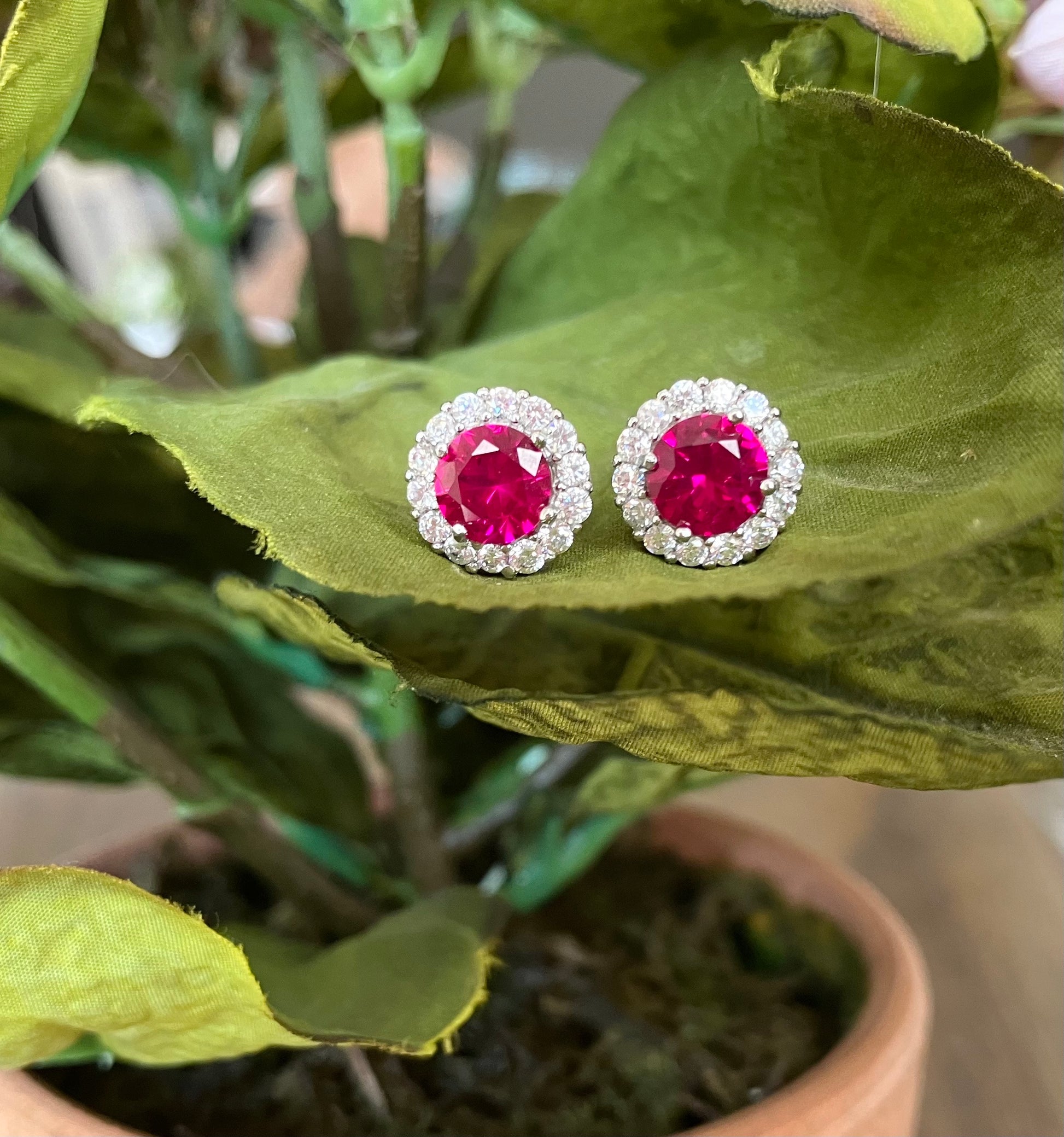 These earrings are stunning, from the detail work and cz's on the sides to the brilliance of the shining halo on the front. Set in sterling silver, these earrings have been rhodium-plated so they keep that shiny silver luster! The center gemstones are round lab-created rubies with a halo of white round cz's surrounding them. If you love to stand out in a crowd, these halo earrings are a must have piece you should add to your collection!