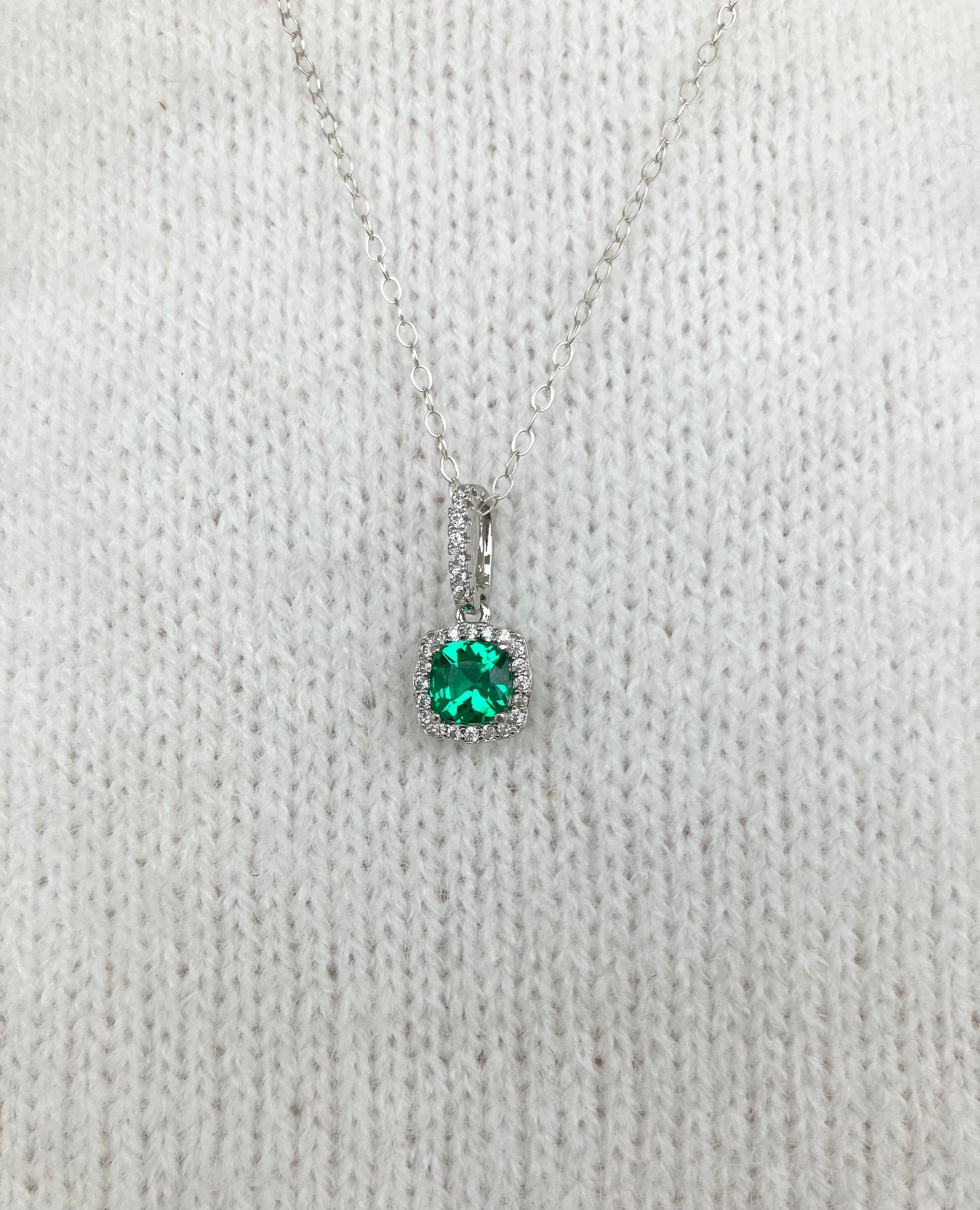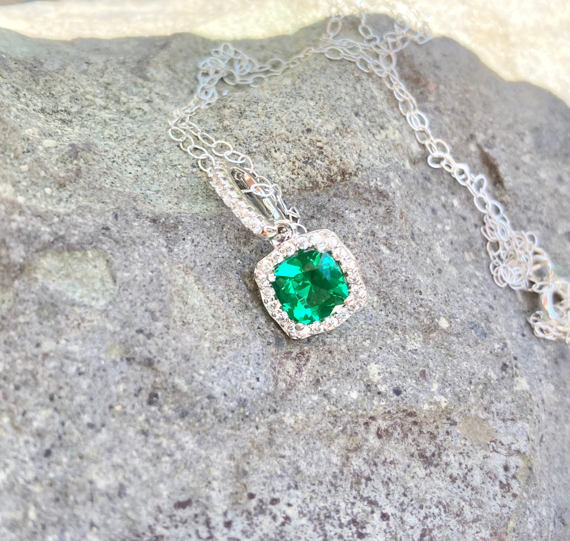 This beyond stunning necklace is perfect for all you May babes! The birthstone color for May is green, and this gorgeous pendant necklace features a green cushion cut cubic zirconia surrounded by a halo of white round cubic zirconia that extends up the bail. The chain is 20" long and is set in sterling silver and the pendant has rhodium plating over sterling silver.