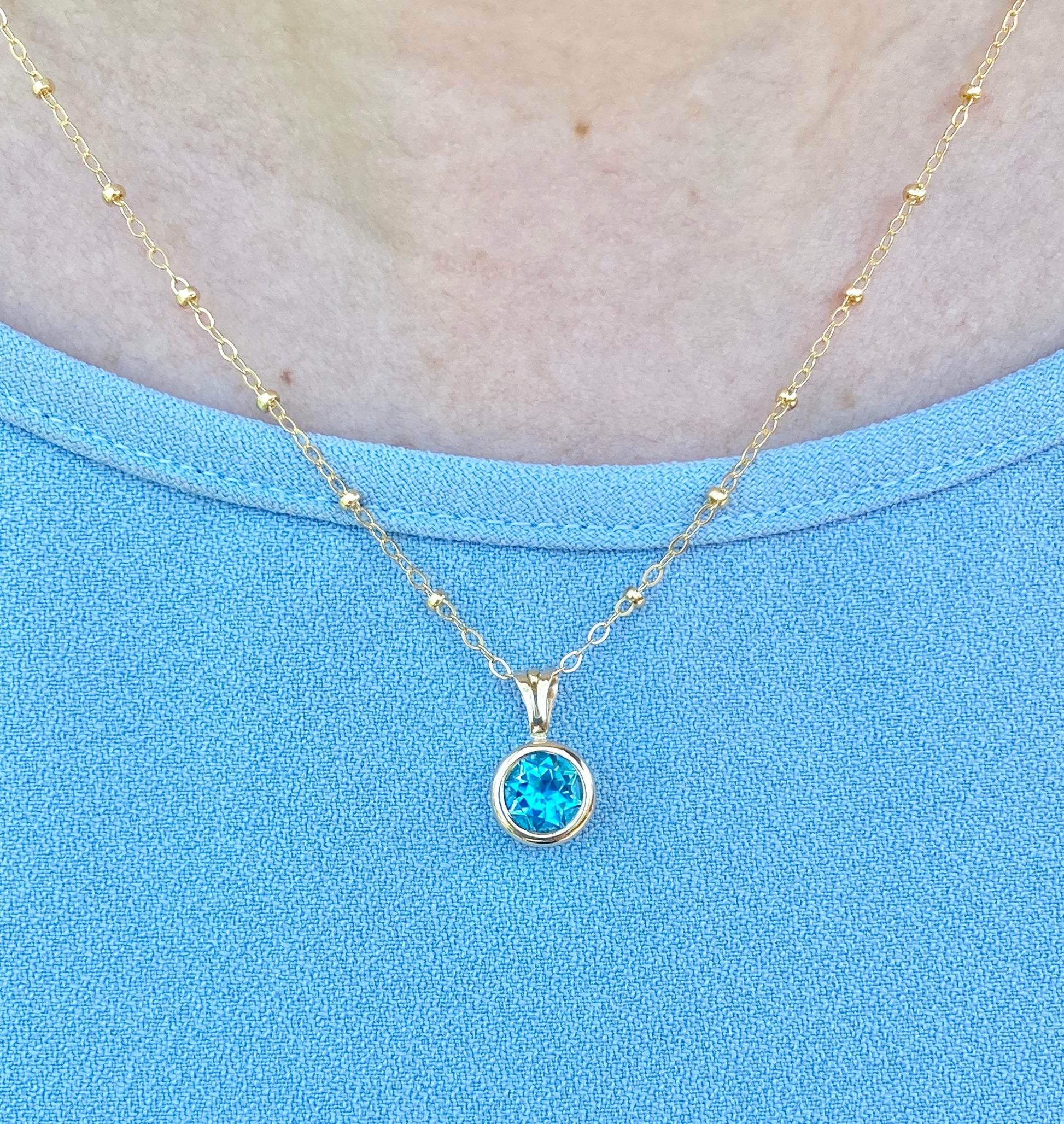 This eye-catching necklace is the perfect color of blue and will get you sooo many compliments! Perfect for summer, it features a yellow gold-filled 18" long chain with gold bead stations and a beautiful 8mm blue topaz faceted stone set in a 14K yellow gold bezel pendant. This will become your everyday, favorite piece!
