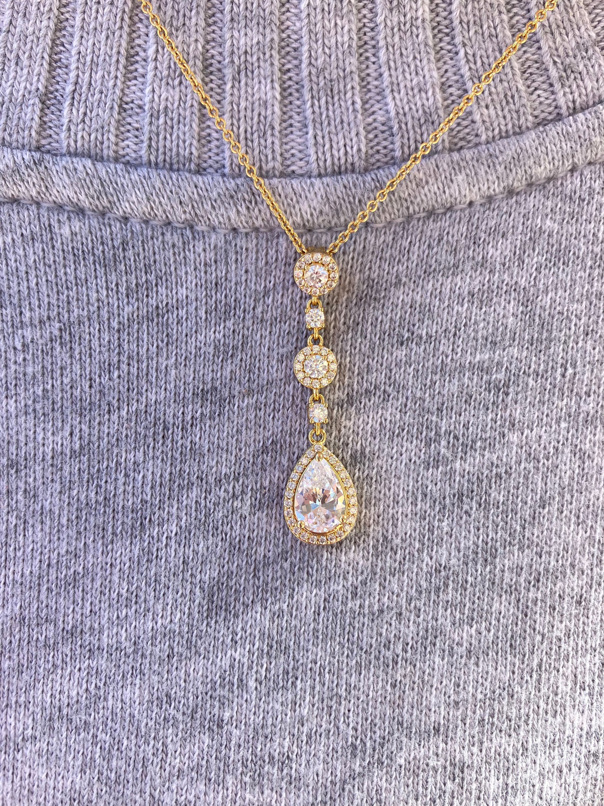 This beautiful drop necklace features two round CZ's and a pear shaped CZ surrounded by halos of smaller CZ's. This necklace would compliment any outfit and also goes well with all our yellow toned earrings!